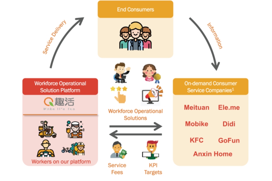 相比传统用工模式,灵活用工意味着更低的用工成本和更高的产能效率,以及标准化的服务能力。趣活在其中扮演的角色,相当于一个连接者,通过对劳动力的调配与管理,将平台提供的商品与服务传递给消费者,大致有点像劳动力市场的“掮客”。
