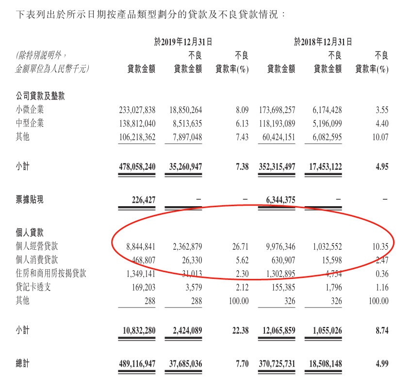 截至2019年末,锦州银行公司贷款的不良贷款率为7.38%,较上年末增加2.43个百分点;个人贷款的不良贷款率为22.38%,较上年末增加13.64个百分点。
