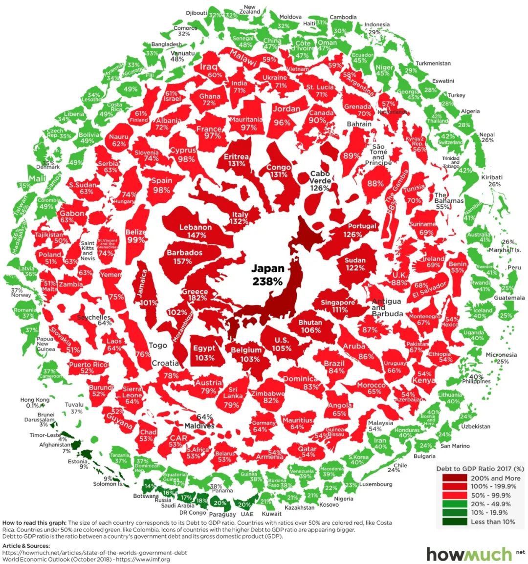 2019年日本国家债务总额达1103.35万亿日元,政府债务占GDP比率达238%,为全球最高。