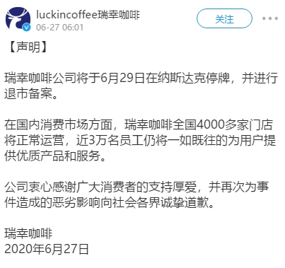 6月27日,瑞幸发布声明,国内瑞幸咖啡4000多家门店仍将正常运营。