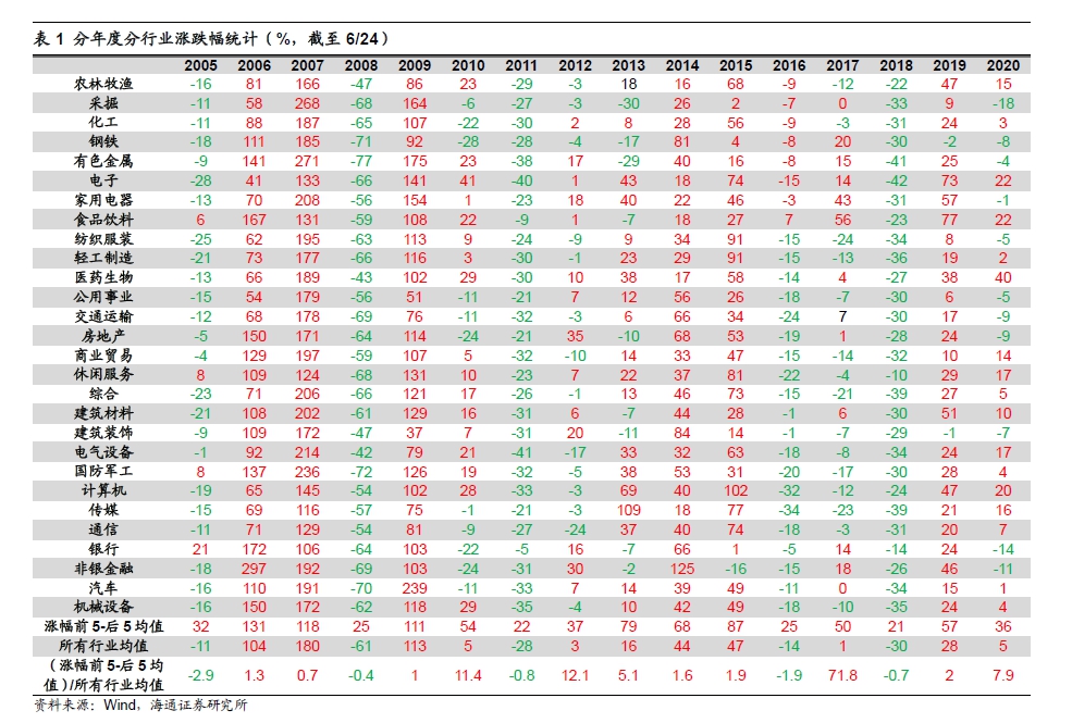 今年上半年快结束了,在疫情爆发的背景下A股体现了很强的韧性,其中行业分化明显,医药、食品饮料、电子涨幅超20%,而金融、煤炭跌幅也超-10%,我们近期报告《各行业头部集中加速中-20200623》从市值角度对风格进行分析,本月月报从年度和牛熊两个维度,对比历史,分析当下行业分化情况。