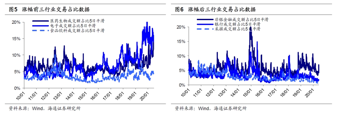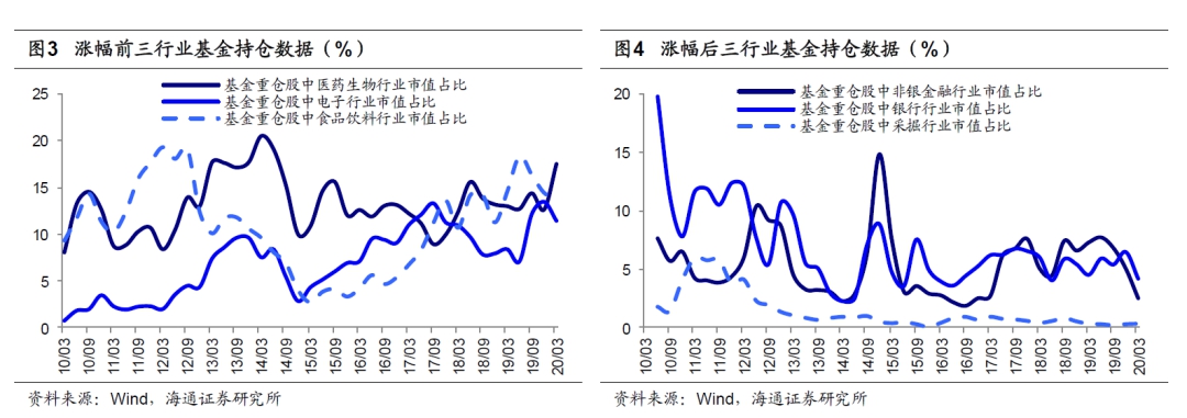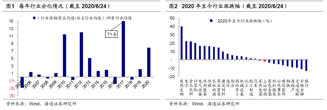 今年上半年行业分化程度已经排名历史第四。我们以相同的办法计算年初至今(6/24,下同)行业分化情况,首先从行业涨跌幅看,年初至今涨幅前五行业包括医药生物(涨幅40%)、电子(22%)、食品饮料(22%)、计算机(20%)、电气设备(17%),跌幅前五行业包括采掘(跌幅-18%)、银行(-14%)、非银金融(-11%)、交通运输(-9%)、房地产(-9%)。观察简单的涨跌幅后,我们继续从机构配置和交易占比两个视角审视今年行业分化。从机构持仓看,基金配置分化与行业涨跌表现基本一致,今年涨幅前三行业20Q1基金重仓股市值占比中(预计Q2的数据更高,这几个行业Q2涨幅大),医药生物占比17.6%,处于历史自下而上76.0%分位;电子占比11.5%,处84.0%分位;食品饮料占比13.8%,处66.8%分位。而跌幅前三行业20Q1基金重仓股市值占比中,采掘占比0.4%,处4.6%分位;银行占比4.2%,处7.5%分位;非银金融占比2.5%,处5.0%分位。从交易额占比看,行业热度也与涨跌幅表现匹配,今年涨幅前三行业当前(6/24)交易额占比,医药生物占比13.0%,处于历史自下而上72.1%分位;电子占比15.7%,处71.7%分位;食品饮料占比4.3%,处32.0%分位。而今年跌幅前三行业当前(6/24)交易额占比,采掘占比0.8%,处1.6%分位,银行占比1.8%,处7.4%分位,非银金融占比6.9%,处25.6%分位。最后从历史对比看,今年行业涨幅前五均值-后五行业均值36%,相比2005-2019年均值61%,仍处于低位,但使用标准化处理后,今年(行业涨幅前五均值-后五行业均值)/所有行业均值为7.9,高于2005-2019年均值6.8,仅次于我们前面提到的2010年11.4、2012年12.1、2017年71.8,而今年只有上半年时间,行业分化程度已经排名历史第四了。