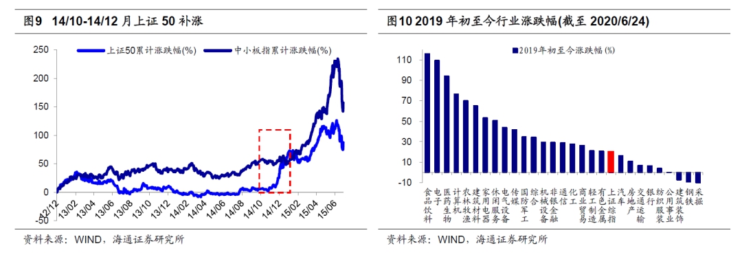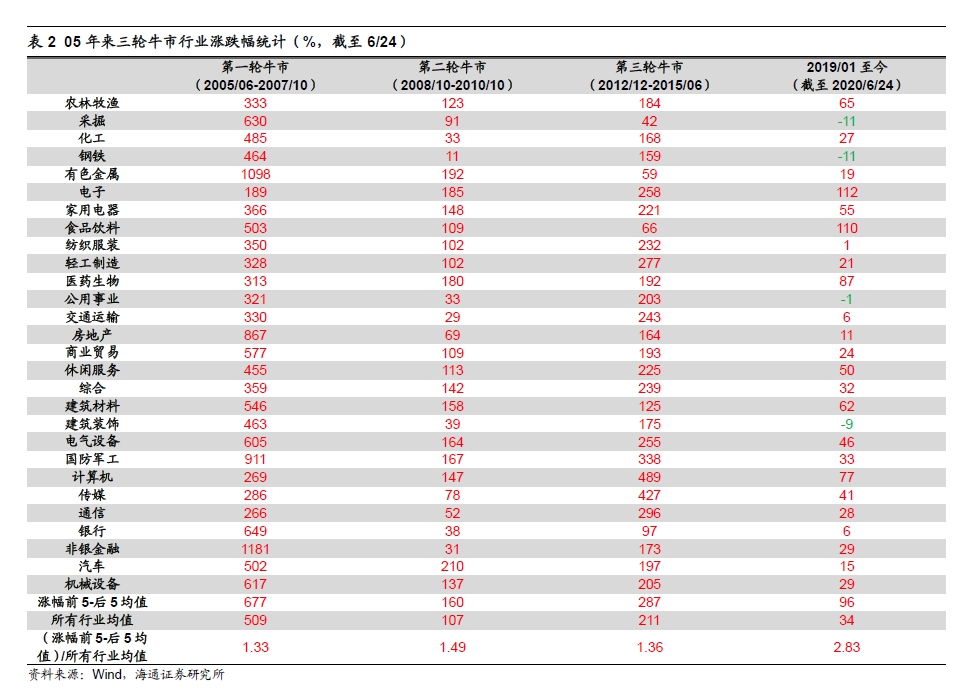 本轮牛市至今行业分化已明显超越历史,注意未来的轮涨、收敛。我们一直提出19年1月4日上证综指2440点开启新一轮牛市,上证综指2440-3288点是牛市1浪上涨,3288点以来是牛市2浪回调,疫情冲击导致2浪被拉长。从牛熊周期视角看行业分化,19年1月至今(截至6/24,下同)行业涨幅前五均值-后五行业均值96%,低于此前三轮牛市677%,160%,287%。为更好的横向比较,进行标准化,19年1月至今(行业涨幅前五均值-后五行业均值)/所有行业均值,本轮牛市行业间离散度2.83,高于此前三轮牛市1.33,1.49,1.36。从具体行业看,19年1月至今涨幅前五行业是电子(112%)、食品饮料(110%)、医药(87%)、计算机(77%)、农林牧渔(65%)。而涨跌幅后五行业采掘(-11%)、钢铁(-11%)、建筑装饰(-9%)、公用事业(-1%)、纺织服装(1%)。我们前期报告《本轮科技周期到哪步了?-20200217》谈论过,借鉴历史,3浪期间行业表现分化源自利润增速分化,符合时代背景特征的主导产业盈利更好。新时代产业方向是信息化服务化,科技+券商将是这次牛市的主导产业。但牛市中行业分化并非主导产业独涨,实际上轮涨特征更强,类似05/6-07/10大盘蓝筹牛市中07/1-07/3也出现小盘股行情,12/12-15/6科技股牛市中14/10-14/12月也出现金融地产补涨。目前虽然周期和金融地产涨幅居后,但后续也不排除轮涨的可能,我们上周周报《从确定性到成长性-20200621》提出Q4关注低估板块,低估的行业修复需要催化剂,如银行地产、钢铁采掘。我们认为Q4将迎来修复行情,银行地产要等基本面恢复,且历史上Q4的胜率高;而采掘钢铁等主要看国企改革,预计Q3政策重点是“六稳”、“六保”的需求类政策,改革类政策可能要等Q4。