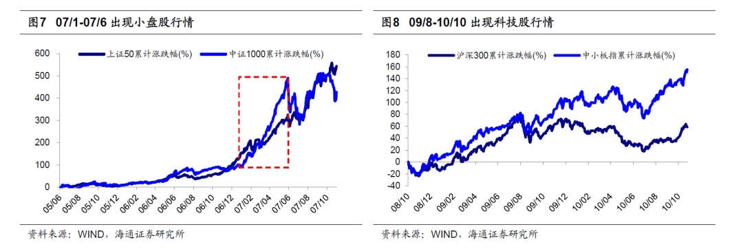 牛市行业离散度低,轮涨特征明显。自然年度视角外,我们再从牛熊视角看行业分化,以A股最近3轮完整牛市05/6-07/10、08/10-10/10、12/12-15/6为观察区间,同样的方法先使用每轮牛市行业涨幅前五均值-后五行业均值,05/6-07/10牛市行业均值差为677%,08/10-10/10牛市行业均值差为160%、12/12-15/6牛市行业均值差为287%。通过标准化,使用每轮牛市(行业涨跌幅前五均值-行业涨跌幅后五均值)/所有行业均值,作为离散度指标,05/6-07/10牛市行业离散度为1.33,08/10-10/10牛市行业离散度为1.49、12/12-15/6牛市行业离散度为1.36。观察行业涨跌幅离散度指标可见,牛市的值比较小,这与前文分析年度涨跌幅结论一致,牛市的年份离散度反而低。此外,牛市中行业分化更多是涨幅大小之差,而自然年度中行业首先是涨跌方向不同,且牛市中存在明显的轮涨特征。我们前期报告《牛市第二阶段什么行业最强?-20190730》分析过牛市期间会出现主导产业,盈利是其决定变量,如05-07年牛市的地产产业链、12-15年牛市的移动互联网。但主导产业上涨过程中,也会出现其他行业的轮涨行情,如05/6-07/10牛市主导行业是地产银行为代表的大盘蓝筹股,但在07年1-6月也出现了一轮小盘股行情,期间中证1000为代表的小盘股涨幅84%,同期上证50涨幅仅25%。08/10-10/10牛市主导行业是地产银行汽车为代表的蓝筹股,但牛市后半段(09/8-10/10)轮转至科技股为主线,期间沪深300为代表的蓝筹股跌幅-9.5%,同期中小板指涨幅45.6%。12/12-15/6牛市主导行业是TMT为代表的成长股,但在14年10-12月也出现了金融地产为代表的价值股修复行情,期间上证50涨幅59.4%,同期创业板指跌幅-4.5%。
