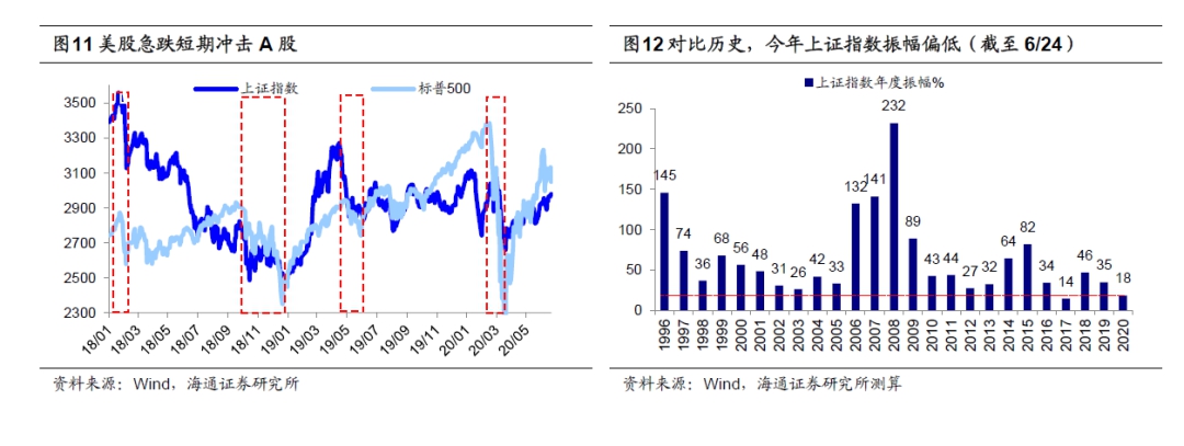 短期市场如回撤空间有限,中期中枢抬升。A股端午休市期间,美股出现大跌,标普500指数6/24跌-2.6%,6/26跌-2.4%,我们前期报告《美股的“虚高”及对A股启示-20200614》提示过,目前美股有点“虚高”,美股估值偏高而盈利趋势向下,“虚高”背后的关键是零利率政策。但基本面较差始终无法回避,最近一周美国新冠肺炎单日新增确诊人数创新高,疫情存在二次爆发的可能性,6月23日以来美国新冠肺炎新增确认人数均维持在3万人以上,其中6月26日新增确诊48392人创出新高,美国已有十个州和城市宣布放缓或暂停复工。从估值看美股处于高位,截至6/26,标普500指数PE(TTM)为25.3倍,超过2005年以来历史均值(17.7倍)向上一倍标准差(±7.6),处于05年以来自下而上90%历史分位。往后美股可能出现类似A股3月份的二次探底,而美股急跌往往对A股短期产生冲击,如18/1、18/10、19/5、20/3。从幅度看,A股如短期回调,向下空间有限,我们上周周报《从确定性到成长性-20200621》分析过上证综指3288点至今市场其实一共探底了3次:第一次见底是19年8月6日的2733点,背景是中美贸易摩擦;第二次见底是20年2月4日的2685点,背景是春节期间国内新冠疫情快速升级;第三次见底是20年3月19日的2646点,背景是疫情在海外升级,全球陷入担忧金融危机的恐慌中。综合来看,这三次都是大型事件冲击下的低点,反映了投资者很大的恐慌或担忧,但是这三次市场见底时上证综指均在2700点上下50个点这个范围,可以说这个底部区域很扎实。从19/1/4开始的本轮牛市大视角看,上证2646点是牛市2浪回调的低点,目前处于为牛市3浪上涨蓄势阶段。从年度看,今年以来上证综指刻画的振幅才18%,历史上一般25%以上。随着复工复产正常化叠加“两会”后6月开始政策逐步落地,我们预计20Q3-21Q2这四个季度企业盈利将保持两位数的上涨,GDP增速也有望逐步回到6%以上,即基本面回升明显,而流动性环境整体维持偏宽松格局,市场的中枢将抬升。当然基本面数据需要后续逐月确认,7月中旬是第一个时间窗口。