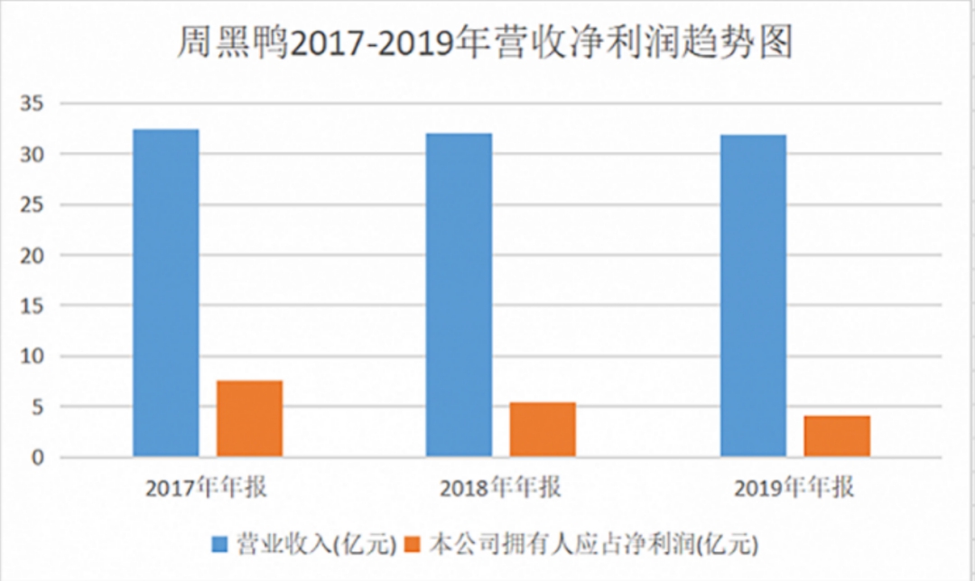 症结在于,从2017年-2019年,周黑鸭连续两年营收和利润双双下降,自2018年把“鸭王”桂冠拱手“让给”绝味食品后,周黑鸭一直未能将其夺回。