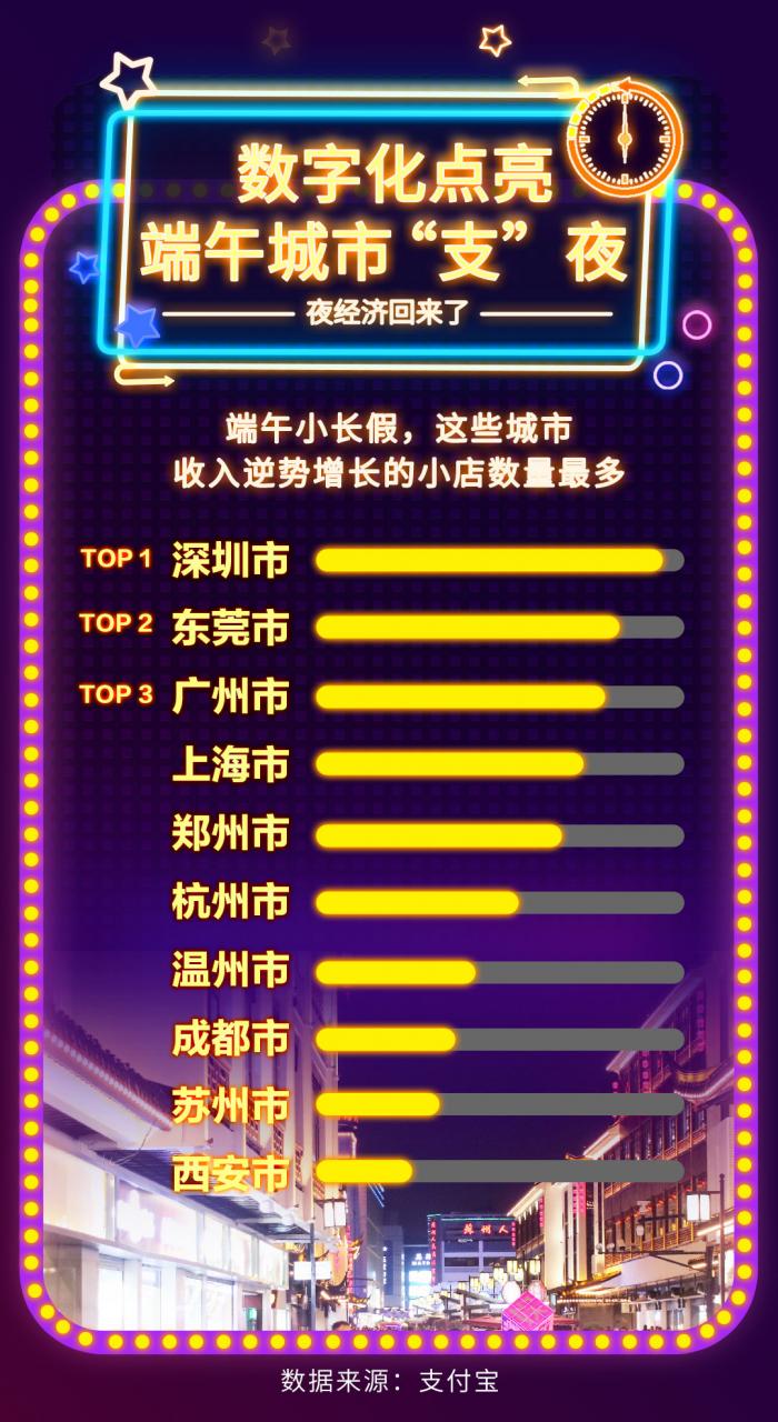 小店数字化程度越高的城市,夜经济越活跃。支付宝数据显示,端午夜间,深圳、东莞、广州、上海、郑州、杭州、温州、成都、苏州、西安这十个城市收入逆势增长的小店最多,其中多数也是支付宝小店消费券报名最多的城市。
