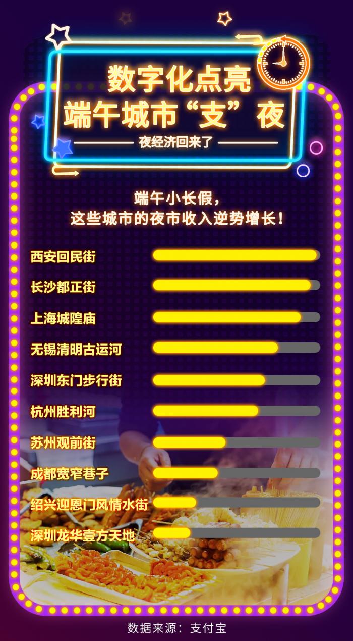西安回民街、长沙都正街、上海城隍庙、无锡清明古运河、深圳东门步行街、杭州胜利河、苏州观前街、成都宽窄巷子、绍兴迎恩门风情水街、深圳龙华壹方天地则是逆势增长最强劲的十大夜市,端午期间交易额已超去年同期,率先反弹。