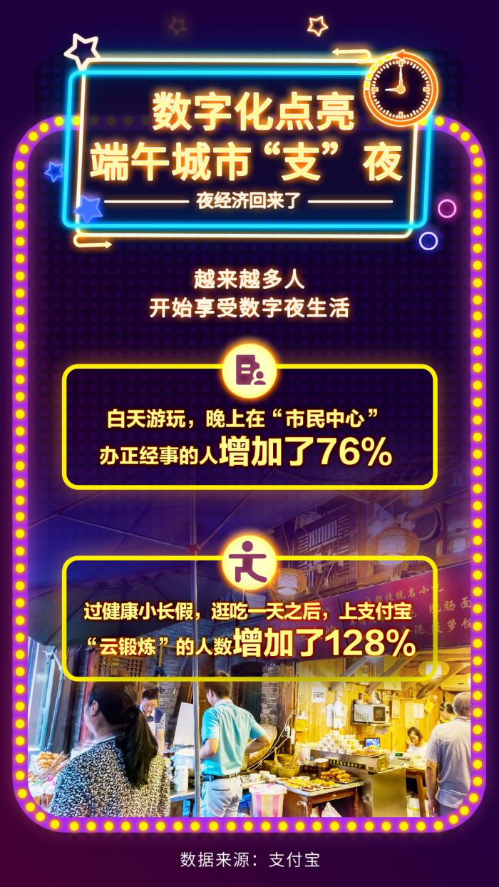 与此同时,支付宝发布的端午夜经济报告显示,今年端午夜间出行人数同比去年提高了46%,人流的活跃让夜经济相比去年呈现出了更强的增长活力,带动城市经济加快复苏。
