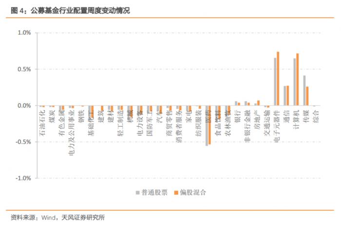 天风证券数据监测结果称,以中信一级行业分类作为股票行业划分依据,截止2020年6月24日,公募基金在医药、食品饮料、银行、非银金融、电子元器件、计算机等行业有着较高的配置权重。但上周,偏股投资型基金在医药、基础化工等行业的仓位下降,在电子元器件、计算机、通信、传媒等行业的仓位提升。
