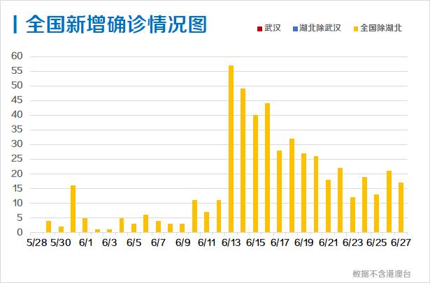 据国家卫健委关于新型冠状病毒肺炎通报的最新数据,6月27日,31个省(自治区、直辖市)和新疆生产建设兵团新增确诊病例17例,其中3例为境外输入病例,14例为本土病例;新增无症状感染者7例,其中境外输入病例4例;新增疑似病例1例;无新增重症病例;当日新增治愈出院病例7例,无新增死亡病例。