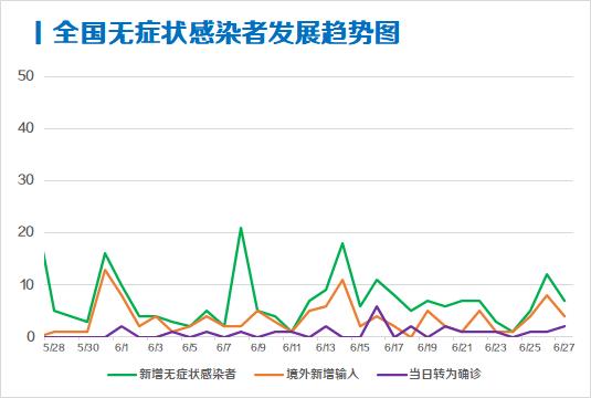 6月27日,全国新增无症状感染者7例,其中境外输入病例4例;当日转为确诊病例2例(无境外输入);当日解除医学观察5例(境外输入2例);尚在医学观察无症状感染者106例(境外输入66例)。