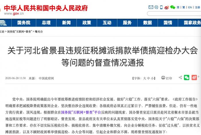 据中国政府网,河北省景县因不顾财政困难举债搞迎检、办大会、筹建形象工程被国务院办公厅督查室通报批评。