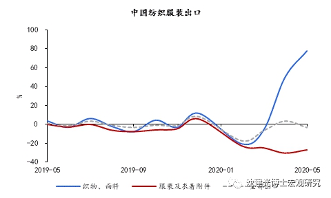 海外疫情对纺织服装产业出口的冲击将在二季度大幅上升。一季度美国GDP下降4.8%,欧盟下降3.5%,韩国下降1.4%,中国香港下降8.9%。由于二季度海外疫情恶化,防控措施升级,因此中国纺织服装行业面临的外需压力已经在二季度爆发。事实上,4月、5月中国出口好于预期的主要原因是海外防疫物资需求大增以及居家办公造成的计算机需求上升,大部分品类出口实际上是负增长。例如,4、5月织物、面料出口大幅上扬,反映了口罩、防护服等防疫物资的出口需求高涨。