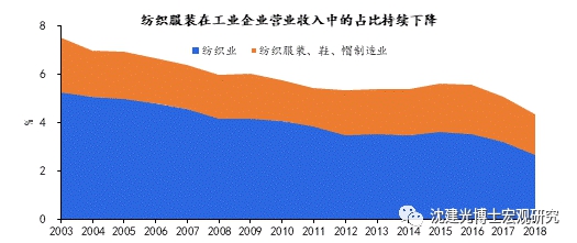 在此背景下,企业较以往更有动机降低对中国的依赖,迁往关税较低、对承接产业发展有迫切需求的地区,如越南、柬埔寨、孟加拉国。其中成品服装生产主要转向越南、孟加拉国,以及土耳其、摩洛哥等新兴经济体。例如,美国品牌耐克(NIKE)和盖璞(GAP)在华生产仅保留了23%和21%,优衣库(UNIQLO)则正在实施让越南承担40%生产的计划。受此影响,纺织服装企业在规模以上工业企业营业收入中的占比几乎腰斩,从2003年的7.5%下降至2018年的4.3%。