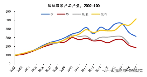 2011年—2017年左右,中国纺织服装产业进入平台期。随着要素成本上升,中国纺织服装产业开始向劳动力成本较低的经济体迁移。期间,纱和化纤的产量增速较前十年显著放缓,布和服装的产量整体上出现了震荡下行的趋势。