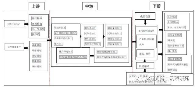 纺织服装产业链较长,上游涉及天然纤维(如棉、麻、毛)和化学纤维生产,中游包括纺纱、织布、印染等加工步骤,下游包括服装、家纺、工业用纺织品等最终产品的生产。