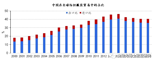 图表5 中国在全球纺织服装贸易中的份额先升后降