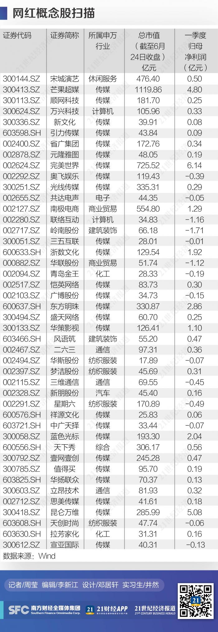 根据21世纪经济报道记者统计,截至目前,市场上的网红概念股已经多达40多家。