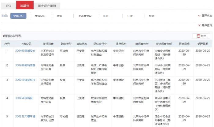 其中,凯龙高科技股份有限公司、山东潍坊润丰化工股份有限公司、安徽华骐环保科技股份有限公司等19家企业申请IPO;高澜股份、朗玛信息等12家企业申请再融资。