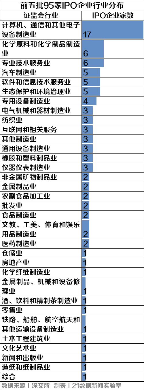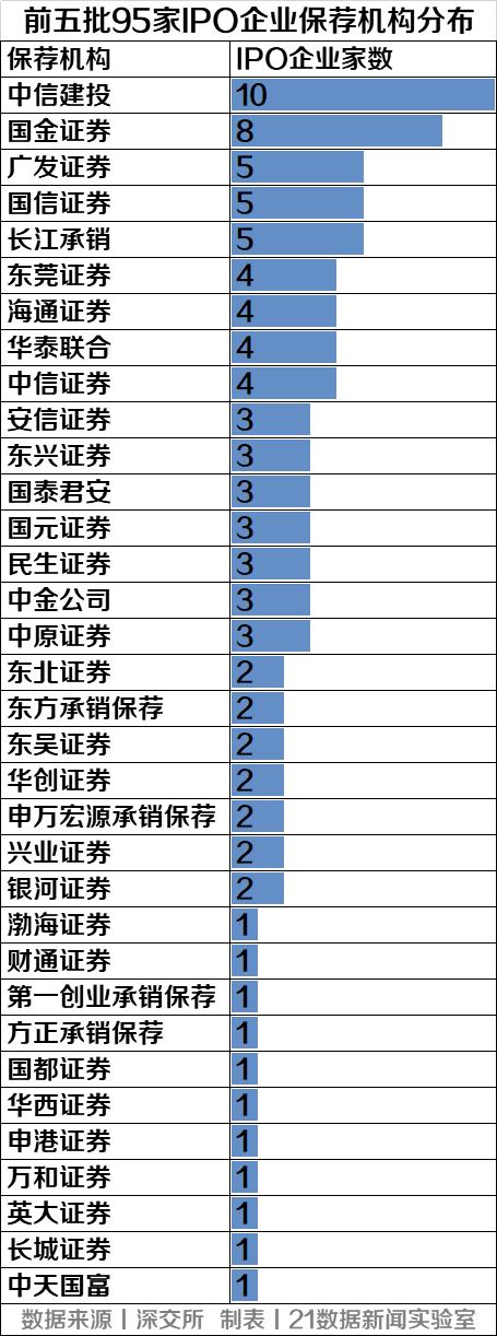 21数据新闻实验室统计发现,首发企业中,以来自广东省的企业数量最多,共有26家;行业方面,以计算机、通信和其他电子设备制造业为主,共计17家;保荐机构方面,中信建投第一,参与了10家企业的注册制IPO;其次为国金证券,参与了8家企业的注册制IPO。