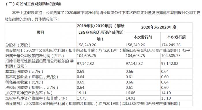 剔除该减值影响后,汤臣倍健2019年净利润为10.46亿元。以此为基数计算,此次定增前公司2020年每股收益为0.66元,定增发行后每股收益为0.64元,降幅不过0.02元。