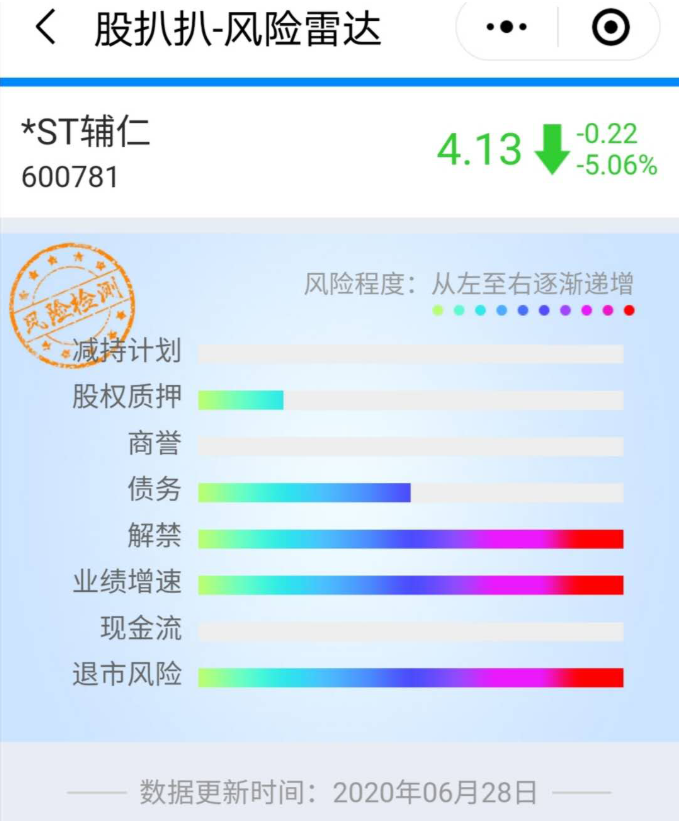 其实,对于这类个股风险,我们可以用专业的风险排除工具,股扒扒小程序来提前看一下。比如输入600781,就可以看到辅仁药业相关信息。