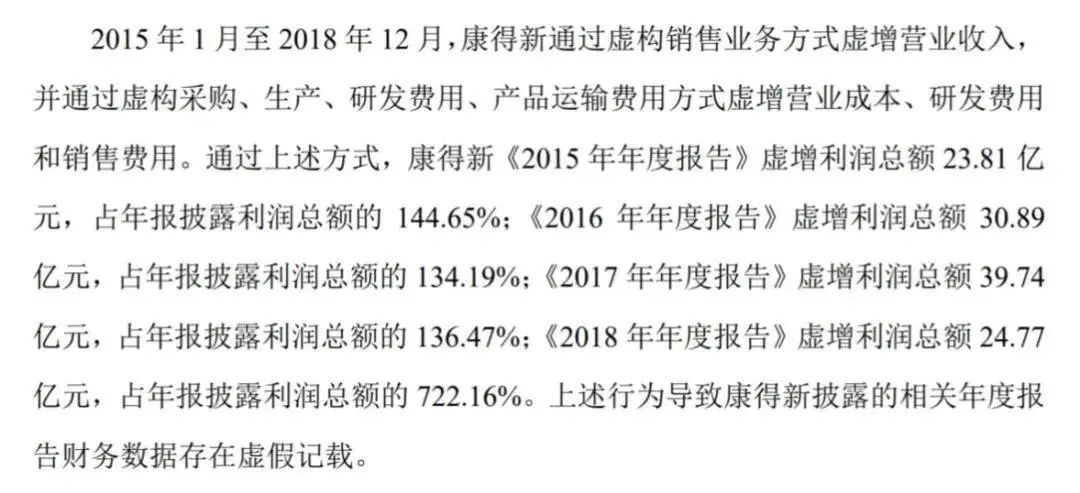 据悉,康得新涉嫌在2015年至2018年期间,通过虚构销售业务等方式虚增营业收入,并通过虚构采购、生产、研发费用、产品运输费用等方式虚增营业成本、研发费用和销售费用。通过上述方式,康得新2015年至2018年分别虚增利润总额23.81亿元、30.89亿元、39.74亿元和24.77亿元,四年累计虚增利润总额119.21亿元。