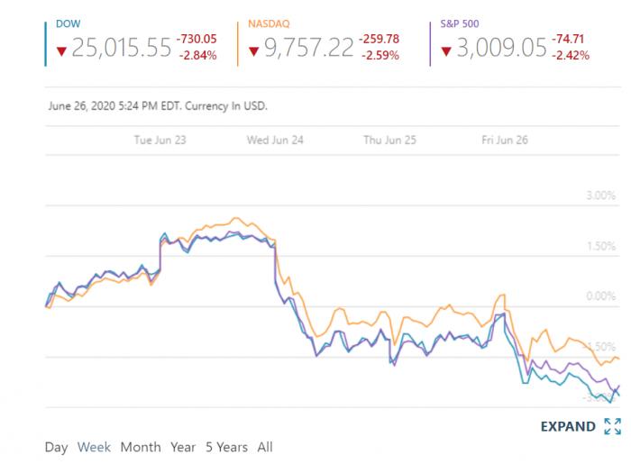 随着美国大部分州确诊病例重新上升,已经有超过十个州考虑暂停或推迟重启经济的步伐。此前基于经济重启乐观预期而出现大反弹的美国股市上周遭遇挑战。美股三大指数上周全线下挫,道琼斯工业指数周跌3.3%,标普500指数周跌2.9%,纳斯达克指数周跌1.8%。