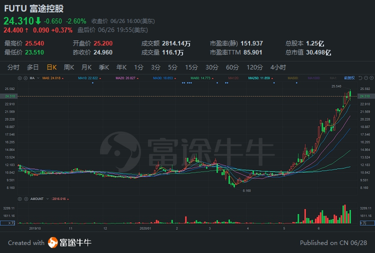 (2)富途控股延续强劲涨势,本周股价上涨9.75%。近三个月来,富途控股累计涨幅已经达到156.71%。