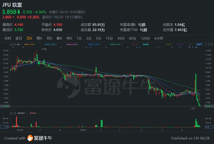 (2)玖富2019年报亏损21.54亿元,股价高位下跌