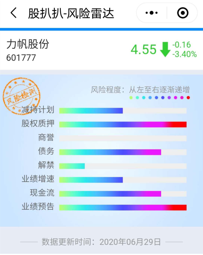 其实,对于这类个股风险,我们可以用专业的风险排除工具,股扒扒小程序来提前看一下。比如输入601777,就可以看到力帆股份相关信息。