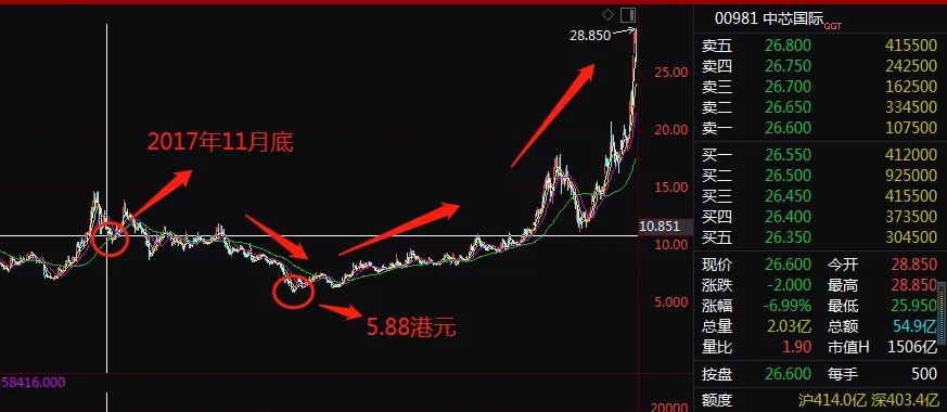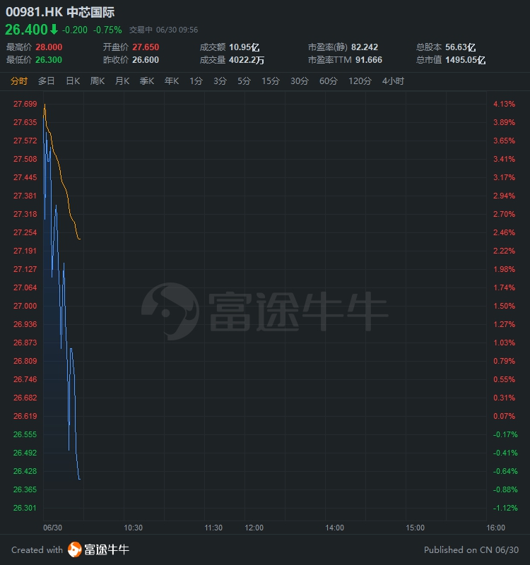 6月29日,中芯国际H股结束了近期接连暴涨的势头,掉头向下大跌6.99%,收报26.6港元,成交额放大到54.9亿港元,总市值为1506亿港元。