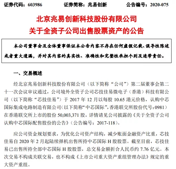 兆易创新表示,应公司资金规划要求,为优化公司资产结构,减少账面金融资产比重,芯技佳易自2020年2月起陆续择机出售所持中芯国际H股股票。截至目前,芯技佳易已出售所持全部中芯国际H股股票,总交易金额折合人民币约7.76亿元。