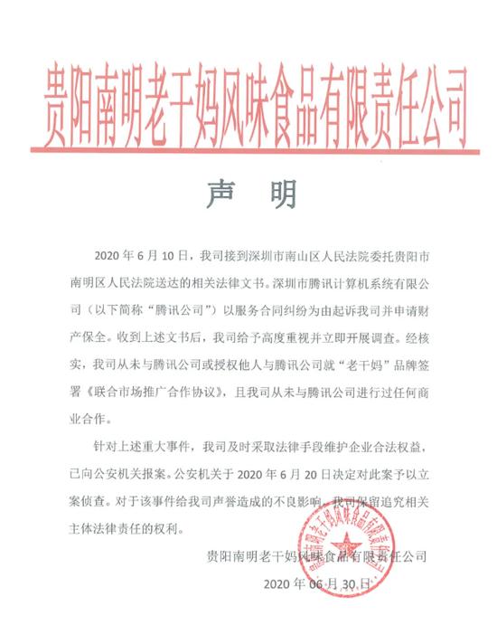 截至发稿,腾讯方面暂未就老干妈的声明进行回应。该事件的后续发展,记者也将继续关注。
