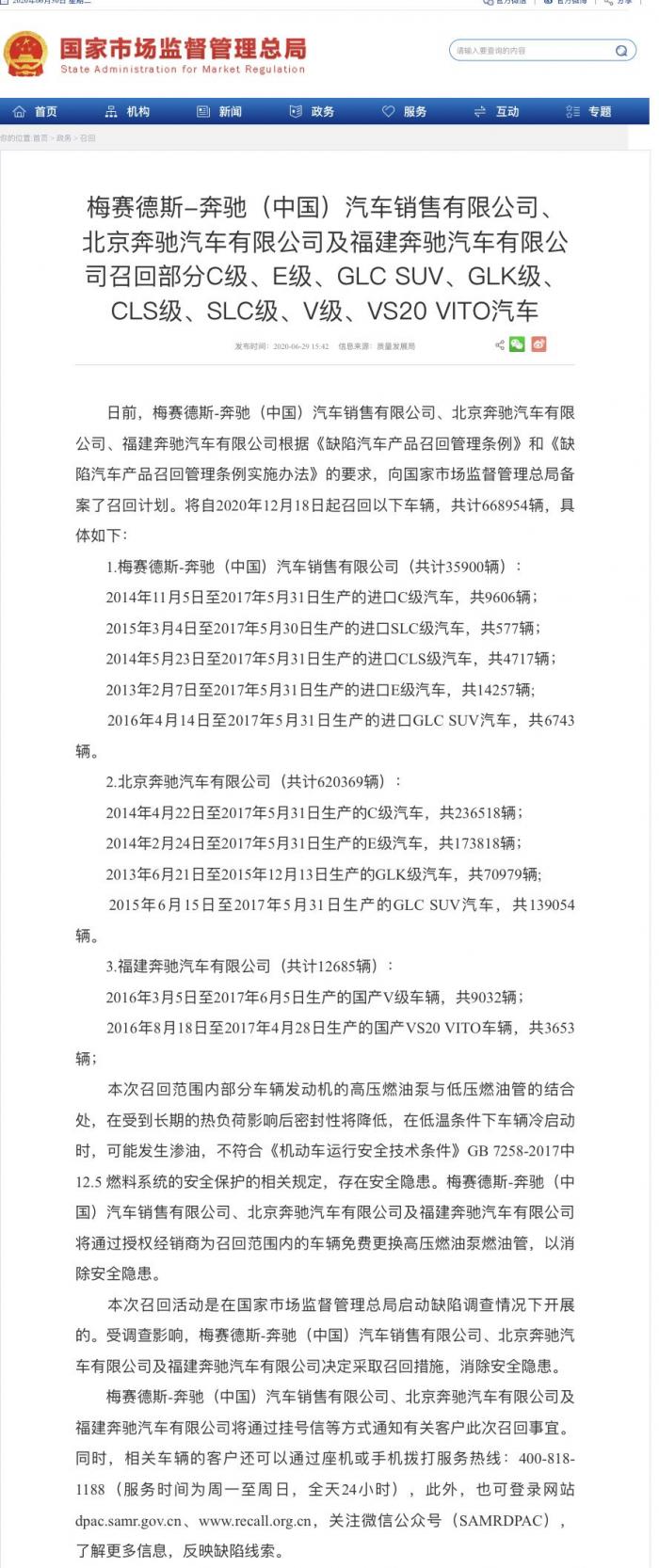 为消除安全隐患,梅赛德斯-奔驰(中国)汽车销售有限公司、北京奔驰汽车有限公司及福建奔驰汽车有限公司将自2020年12月18日起召回668954辆汽车,并通过授权经销商为召回范围内的车辆免费更换高压燃油泵燃油管。