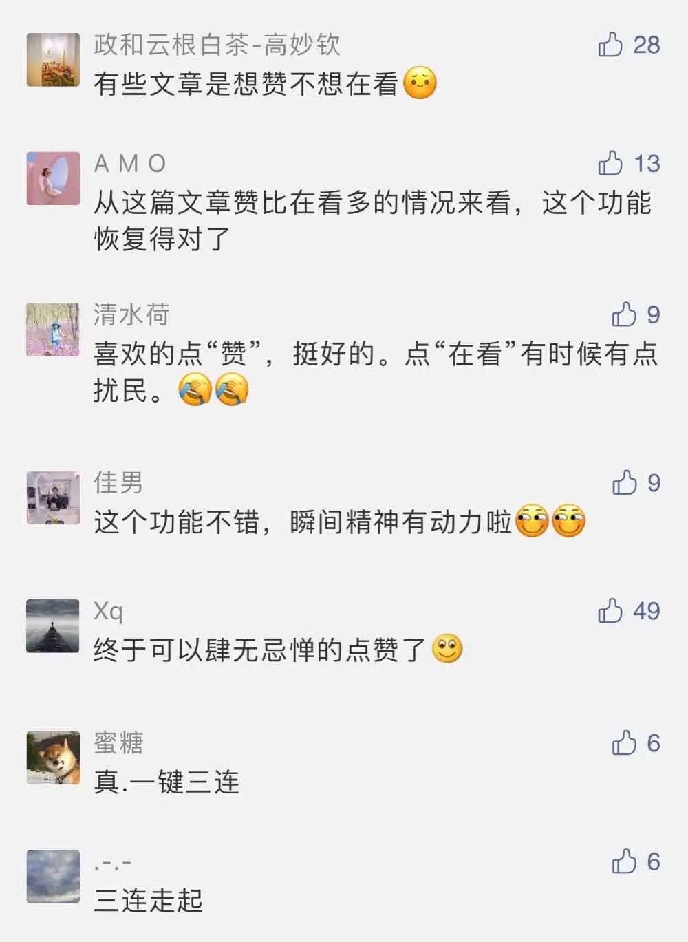 正如微信官方所说,这是“用户对文章的一种轻量的态度表达”,既不用担心点赞的内容会被其他好友发现,也能表达自己对作者或者文章价值的肯定,从很多用户角度来看,“点赞”是肯定,“在看”则更像推荐。
