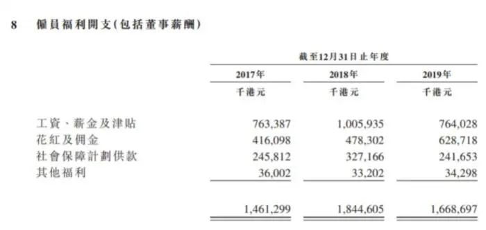 21世纪经济报道记者从招股书上看到,2019年蓝月亮的员工福利开支确实缩减了不少,其中“工资、薪金及津贴”一项从2018年的10.06亿港元下降至7.64亿港元。员工的数量也从2018年的12820名减少至去年底的11196名。