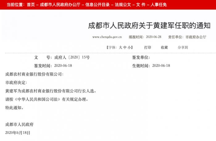 近日,成都市人民政府官网发布了人事任免文件,市政府决定:黄建军为成都农村商业银行股份有限公司行长人选。