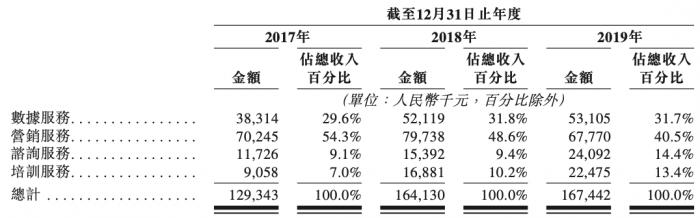 从各项业务收入占比看,公司过去三年中最大的收入来自营销服务,但数据服务、咨询服务、培训服务的收入占比呈上升态势。