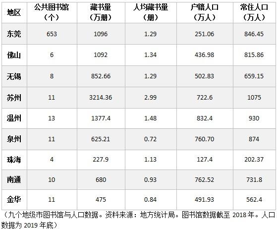 在藏书量方面,苏州位居第一,有3214.36万册藏书,从人均藏书量来看,数据选取在九个地级市中,东莞市是户籍人口与常住人口“倒挂”情况最严重的城市。截至2019年底,户籍人口为251.06万人,常住人口却达到846.45万人,这表明该城市外来人口规模达到595.39万人。