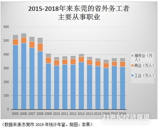 来自东莞统计年鉴的数据,从事工业的人员,其峰值为2006年的482万人,此后逐渐下滑,最低点是2016年的301万人,到2017年回升到316万人,2018年又减少至310万人。