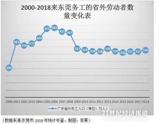 具体而言,东莞对来自广东省外的暂住人口与务工人员的统计,最早于1990年,彼时总量为32.27万人,1994年突破百万。2000年突破200万。2004年数据翻番,达到409.66万人,2006年达到历史最高点480.71万人,此后呈现较明显的下降趋势,但2015年跌至本周期最低的309.99万人后,2016-2018年开始回升,到2018年达到325.60万人。