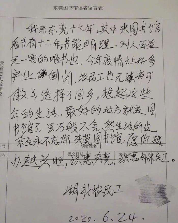 爱好读书的湖北籍农民工吴桂春,因一则在东莞图书馆的留言,顺利找到了新工作。