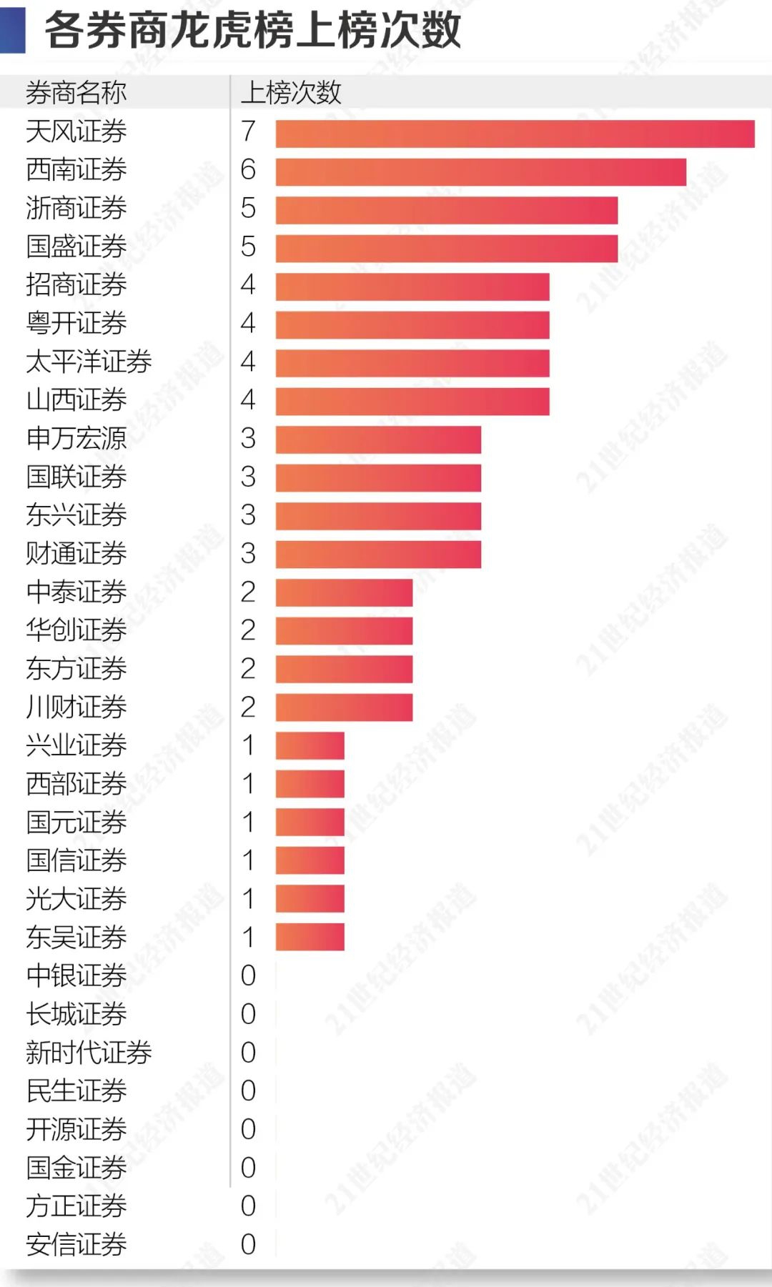 西南证券、浙商证券、国盛证券等中小券商组合内金股上龙虎榜次数同样靠前。