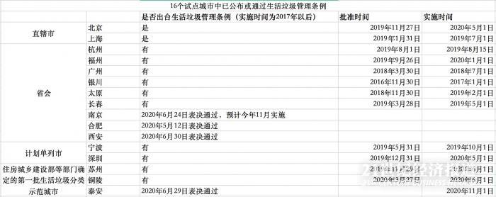 21世纪经济报道记者近日统计发现,截至2020年7月1日,46个试点城市中已有北京、上海等12个城市发布新版《生活垃圾管理条例》,为生活垃圾管理立法;南京、合肥、泰安、西安四市条例已通过,待省人大常委会批准后即向社会公开并施行。