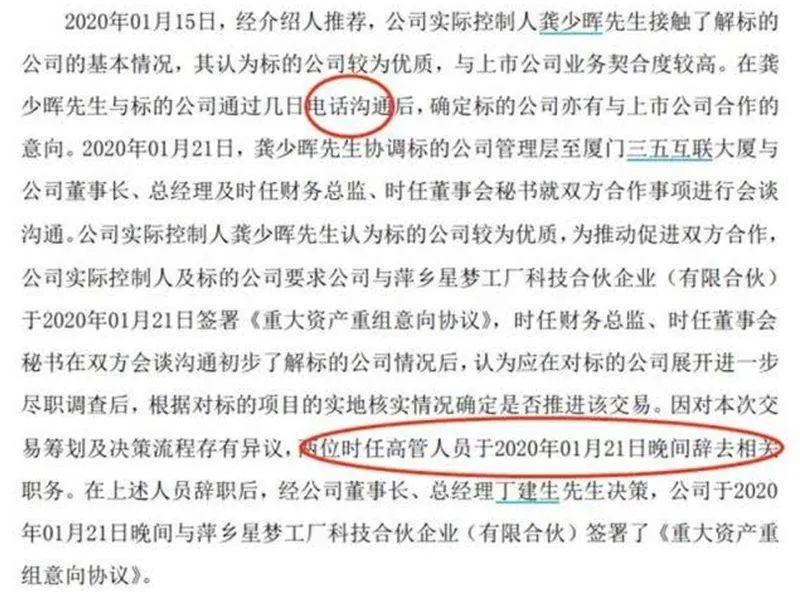 据披露,1月15日,经介绍人推荐,龚少晖接触了解标的公司(即上海婉锐)的基本情况。在与标的公司通过几次电话沟通后,1月21日,龚少晖协调双方高管面谈沟通,最终两位存有异议的上市公司高管当晚辞职,董事长、总经理丁建生决策后,公司于1月21日晚间与萍乡星梦工厂科技合伙企业(有限合伙)签署了《重大资产重组意向协议》。