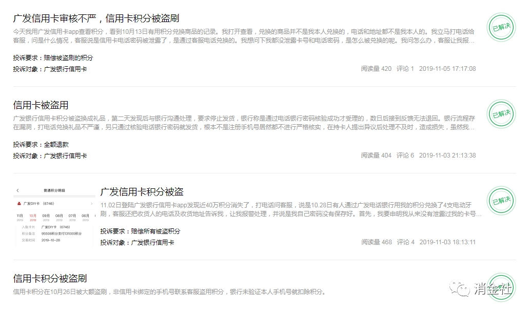 在聚投诉等投诉网站上,信用卡积分被盗刷的投诉内容比比皆是,尤其是广发银行更是此类投诉内容的“重灾区”。