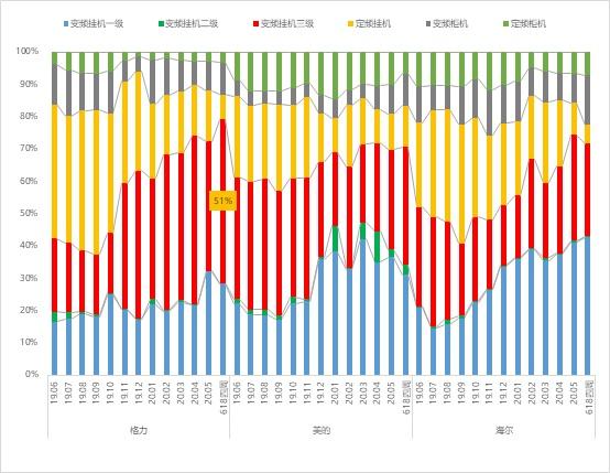 事实上,从去年底新标准发布开始,已经有不少空调企业开启了“清库存”行动。根据奥维云网的监测,从零售端的数据可以发现,目前定频挂机(新四级及以下)的占比已非常低。