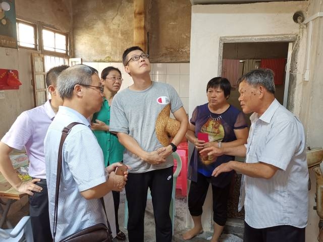 殷秀才查看贫困户家中屋顶裂缝,研究房屋修缮方案。